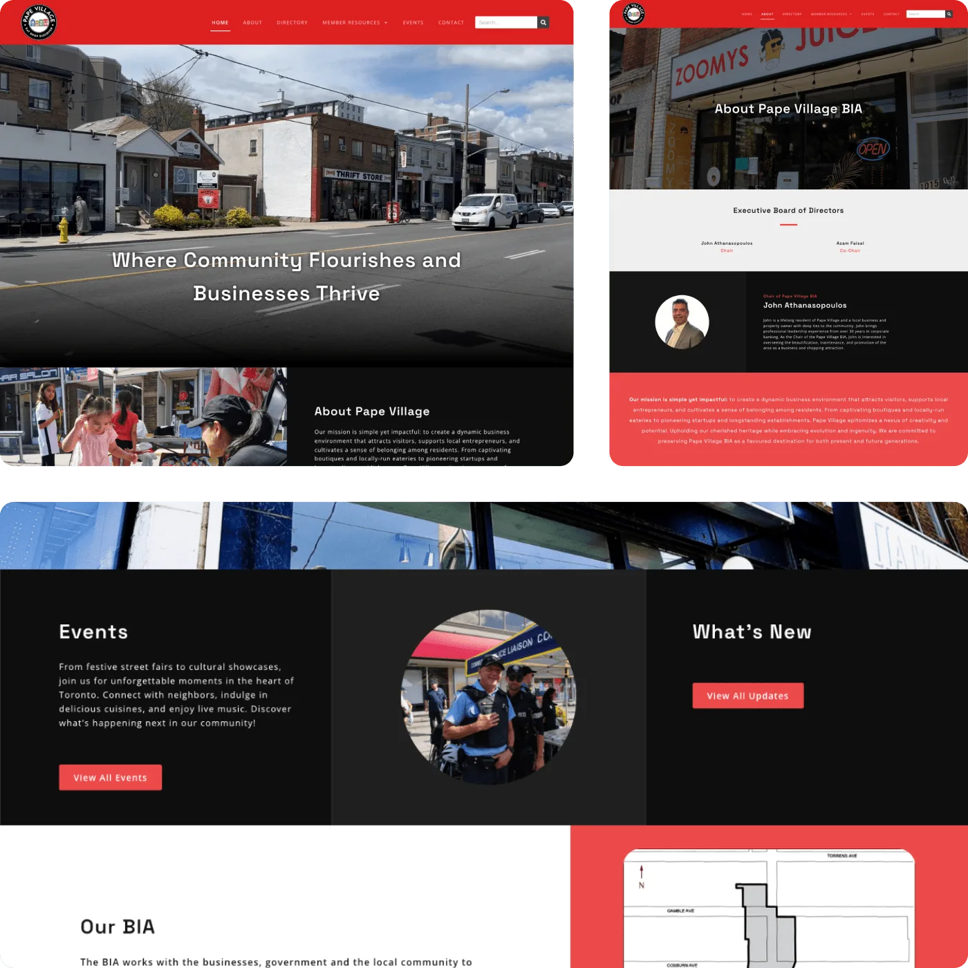 Following colour guidelines and existing social media direction - we worked with the team at Pape Village BIA to establish a strong and bold visual direction. From colours, fonts to layouts. From there, we designed and developed all the remaining pages.